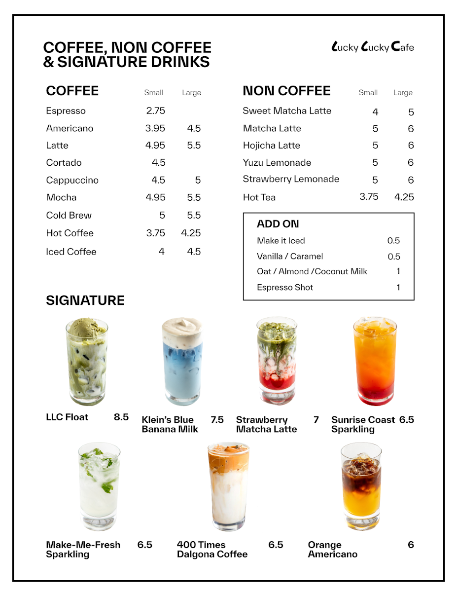 Lucky Lucky Cafe specializes in a delightful Hojicha menu, featuring lattes in variations like Brown Sugar and Lavender, each priced around $7.50. For something refreshing, don't miss their creative non-coffee options, including Mint Tea Lemonade and Strawberry Lemonade, perfect for a sunny day.